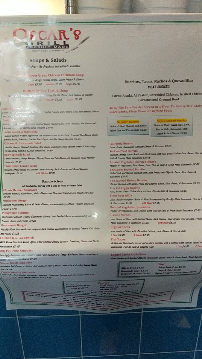 From a reviewer’s perspective, Oscar’s Grill offers a diverse and satisfying menu that highlights classic Mexican favorites along with American breakfast and refreshing drinks, making it a versatile dining spot. Popular platters like Carne Asada Platter, Grilled Chicken Platter, and Carnitas Platter provide hearty options, while items such as Chicken Flautas and Baby Spinach Enchiladas add variety. The burrito selection stands out with choices like Regular Burrito, Surf And Turf Burrito, The Super Seafood Burrito, California Burrito, and Bean & Cheese Burrito, catering to both meat lovers and vegetarians. The à la carte section features crowd-pleasers like Street Tacos (Chiquitos), Two Enchiladas, Grilled Tilapia Fish Tacos, Two Grande Soft Or Crispy Tacos, and Two Baja Fish Tacos, perfect for mixing and matching. Sides such as Carnitas, Salsa Fresca, Grilled Chicken Breast, Chips & Guacamole, and Hand Cut Tortilla Chips complement any meal well. Lighter options include Tostada Salad, Chicken Enchilada Soup, Rustic Chicken Tortilla Soup, Taco Salad, and House Salad. For comfort food cravings, Super Vegetarian Quesadilla, Loaded Carne Asada Fries, Flour Quesadilla, and Super Nachos are flavorful choices. The menu also features treats like Soft Serve Ice Cream, Strawberry Milkshake, and Chocolate Milkshake, along with smoothies such as Sweet Berry Almond, Beets & Raspberry Smoothie, Lovely Green, Peachy Mango, and Sundae Smoothie. Breakfast items including Plain Bagel, Croissant Sausage Sandwich, Breakfast Burrito, Scrambled Eggs With Bacon Or Sausage, and English Muffin Sandwich make it a great morning stop, while drinks like Pina (Pineapple), Horchata (Rice), Mango, Fresa (Strawberry), and Jamaica (Hibiscus) round out the menu with refreshing flavors. Overall, the menu is extensive, flavorful, and offers something for everyone.